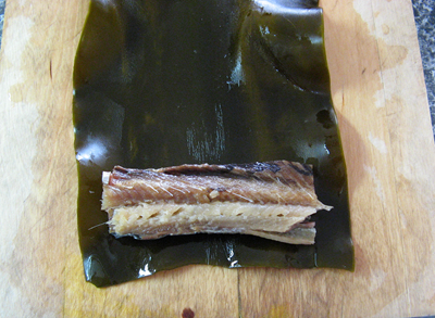 ニシンを昆布の上に置き、巻いて行く 。 巻き終わったら爪楊枝で留める。