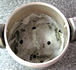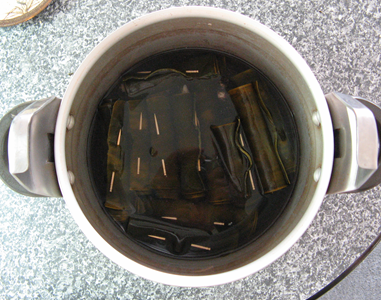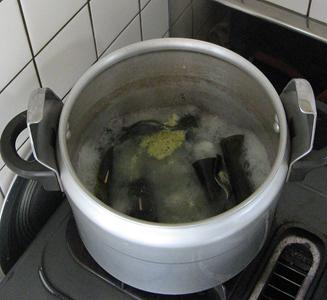 全てまき終わりました。 それを18年間使用して来た圧力鍋に入れたのが右図。