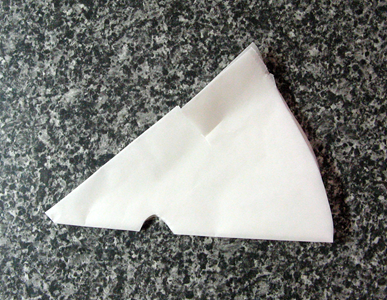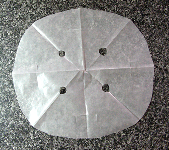 ここからは落し蓋の作り方、クッキングシート(圧力釜の直径より大きい物)をほぼ正方形にカットしたら次のように折り曲げる。